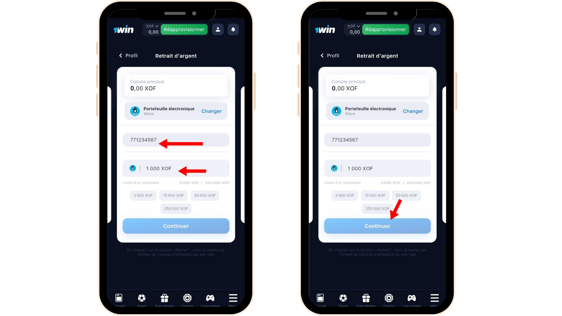 Sélectionnez Wave comme méthode de paiement lors du 1win dépôt mobile money Sénégal. Entrez votre numéro de téléphone associé à votre compte Wave. Saisissez le montant que vous souhaitez déposer. Validez la transaction en cliquant sur « Recharger » pour confirmer votre dépôt 1win Sénégal avec Wave.