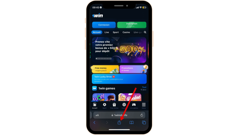 Ouvrez votre navigateur Web Safari et rendez-vous sur le site officiel de 1win. Une fois la page principale du site, appuyez sur le bouton de partage.